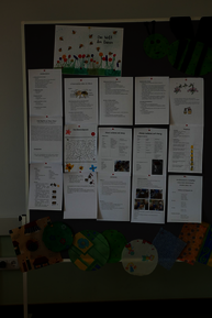 Den Verlauf der einzelnen Projekttage dokumentierten wir durch Fotos und der Darbietung unserer selbstgestalteten Buchseiten auf einer Stellwand. Die Ergebnisse der Projektwoche wurden am Freitag früh in einem Gallery Walk im Schulhof für alle Schüler der Lorenz-Kaim-Schule ausgestellt.