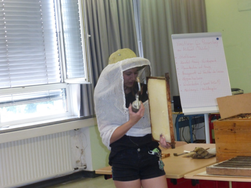 Als Referenten luden wir den Imker Jakob Scherer ein, der uns mithilfe von Schautafeln und Anschauungsmaterialien über seine Arbeit als Imker, den Bienentanz, den Honigbienenstaat, die Paarung der Königin, die Bienenkrankheiten und gefährliche Chemikalien informierte. Auch hatte er verschiedene Bienenprodukte wie Propolis, Wachswaben und Honig zum Probieren dabei. Mit Ausdauer beantwortete Herr Jakob Scherer die vielen Fragen, welche die Gruppe im Vorfeld gesammelt hatte. Zum Abschluss bekamen wir mehrere Gläser Honig geschenkt, so dass wir die ganze Woche Honigbrote in der Pause genießen konnten.