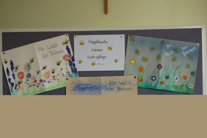 Daraus entwickelte wir die Idee, das Thema „Bienen für Hortkinder“ in unserer Projektwoche vom 18. bis 22.07.2022 anzubieten. Es entschieden sich 9 Schülerinnen und Schüler der Berufsfachschule für Kinderpflege 10 und 11 für dieses Projekt, welches von drei Lehrerinnen betreut wurde.
